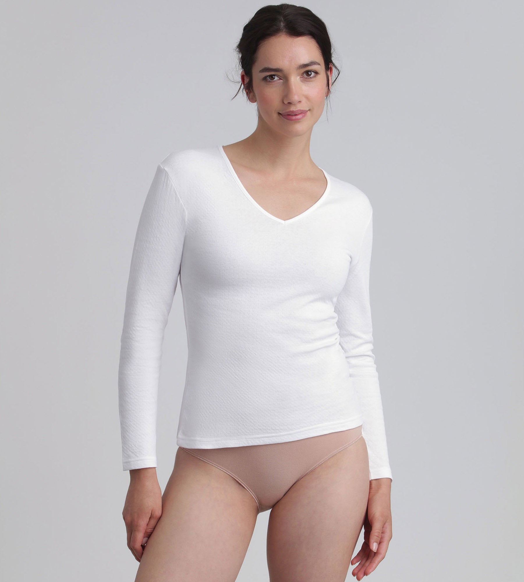 Discover our long-sleeved v-neck t-shirt in white from Thermal Natural collection. Optimal comfort guaranteed thanks to its ultra stretch and soft 100% cotton fabric. This long-sleeved t-shirt provides you warm effect when wearing thanks to its natural thermal fiber. Adopt the timeless design of this v-neck t-shirt for everyday wear. Wear it under your clothes or as a basic t-shirt with a jean.