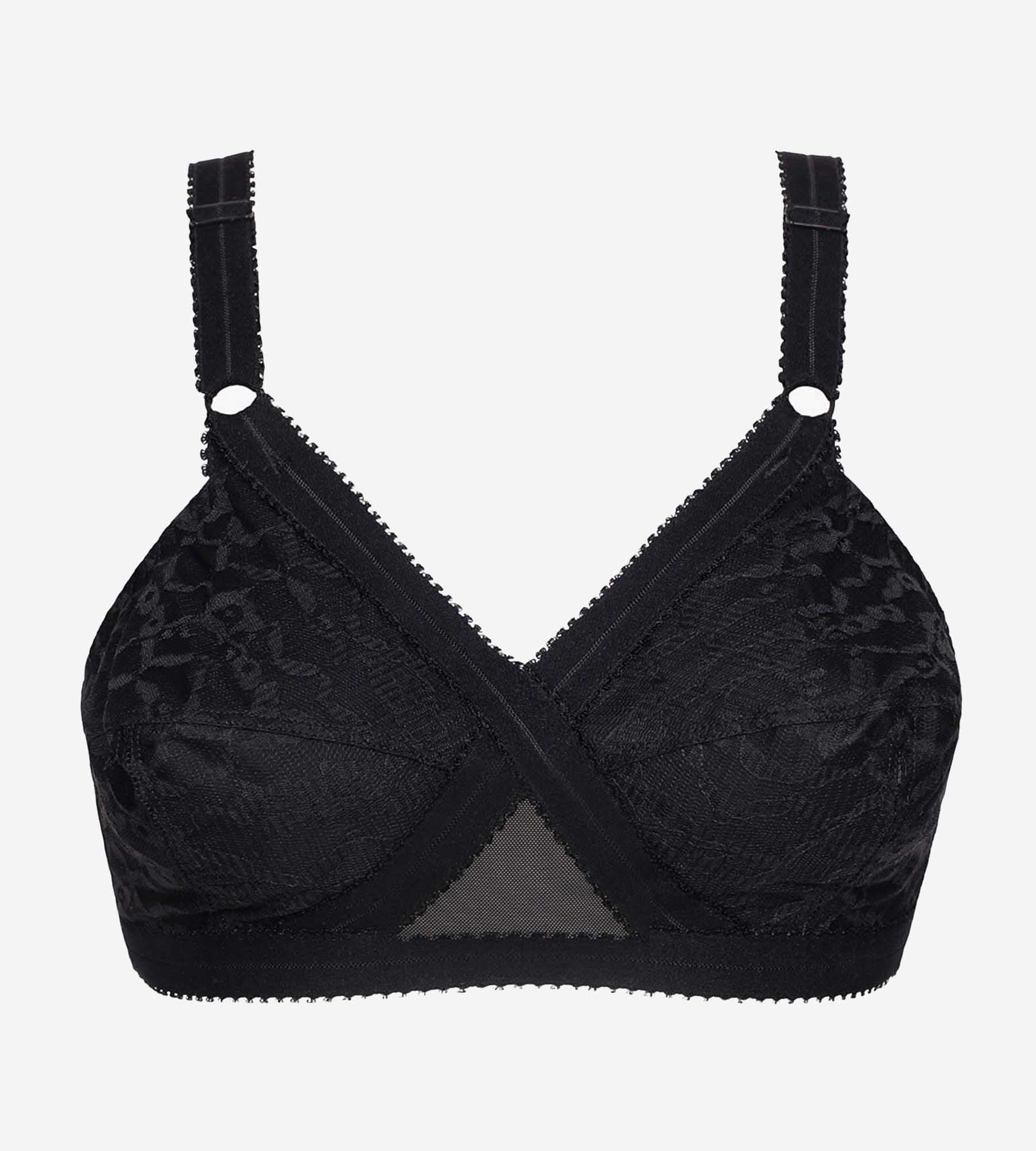 The Playtex® Cross Your Heart 556 bra in black will be you new favourite go to! This classic shape is one of our bestsellers due to its X-front shape which perfectly separates and lifts your breasts to enhance your natural shape. You will love the adjustable wide straps and U-shaped back, which work together to give you the support you need all day long. We love the lace detail that gives this bra a more feminine touch..