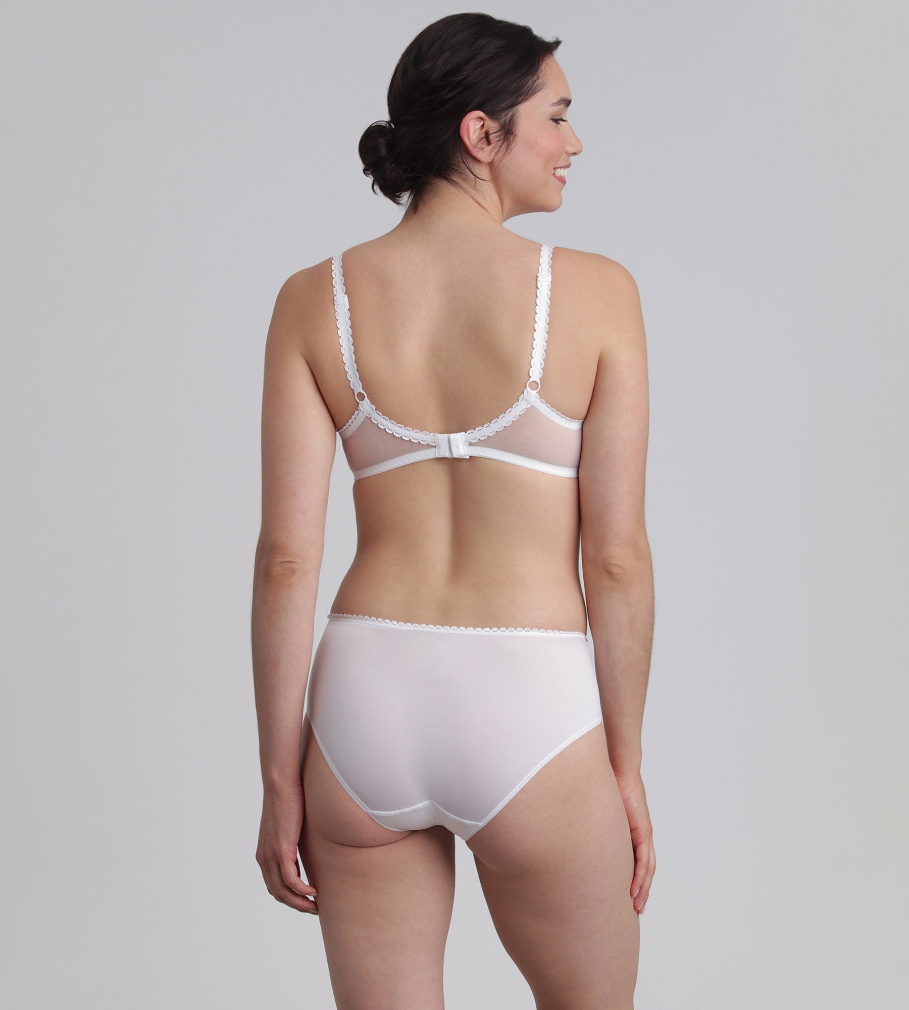 Feel confident with this ultra-feminine balcony bra in white Flower Elegance Recycled. In addition to be chic this underwired bra offers you all support and comfort you need thanks to: its great converage, lined bottom cups, the soft and wide seductive triangle recycled mesh front straps. Under your clothes this bra offer you a pretty neckline. You will love the elegant floral recycled lace and scalloped edges for a georgeous feminine look.