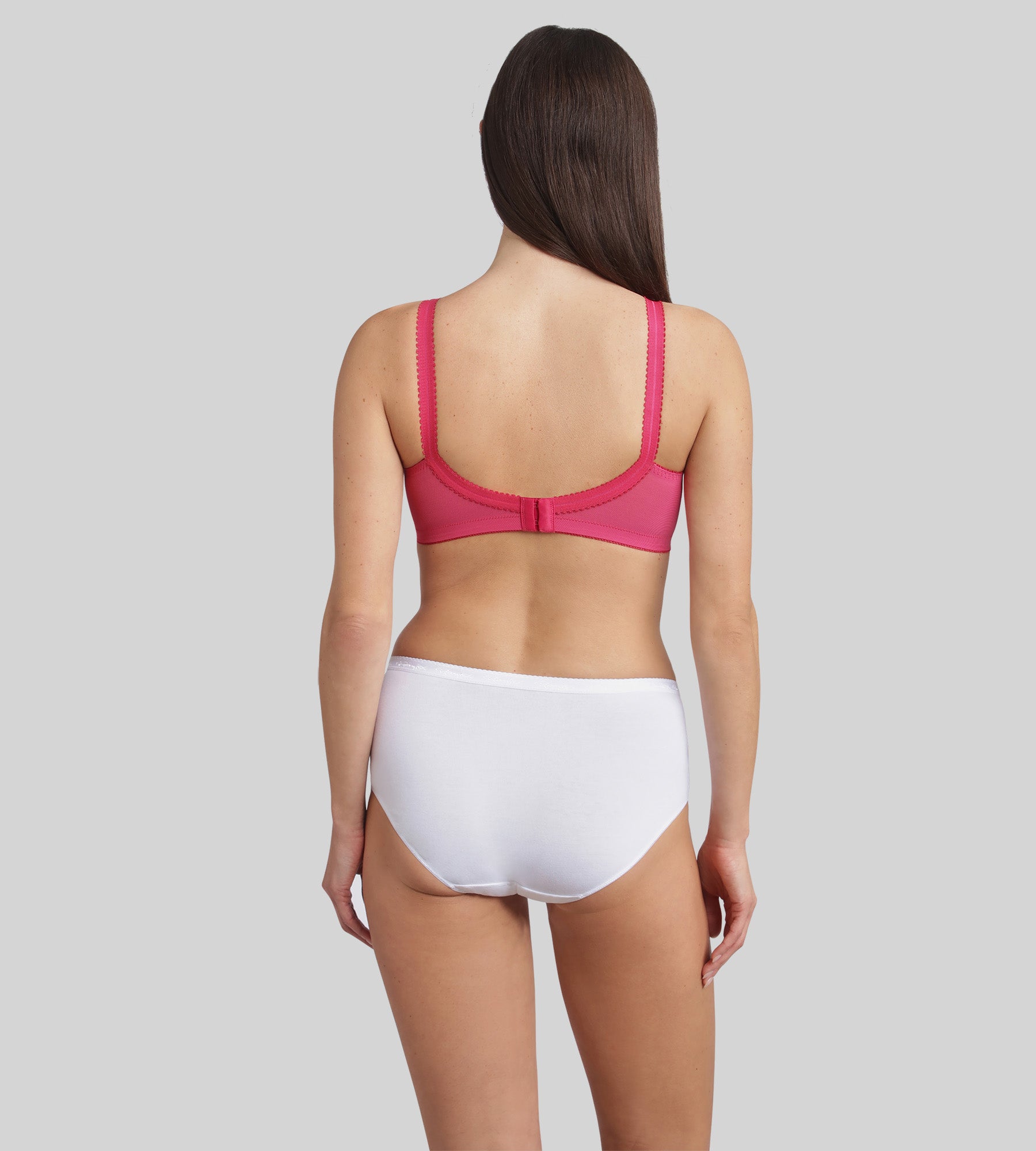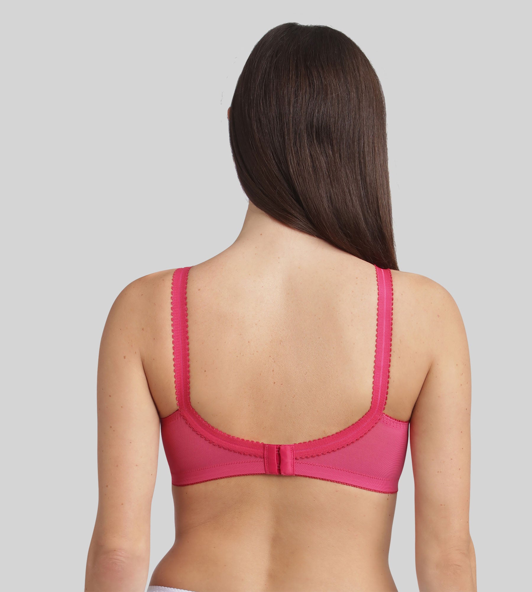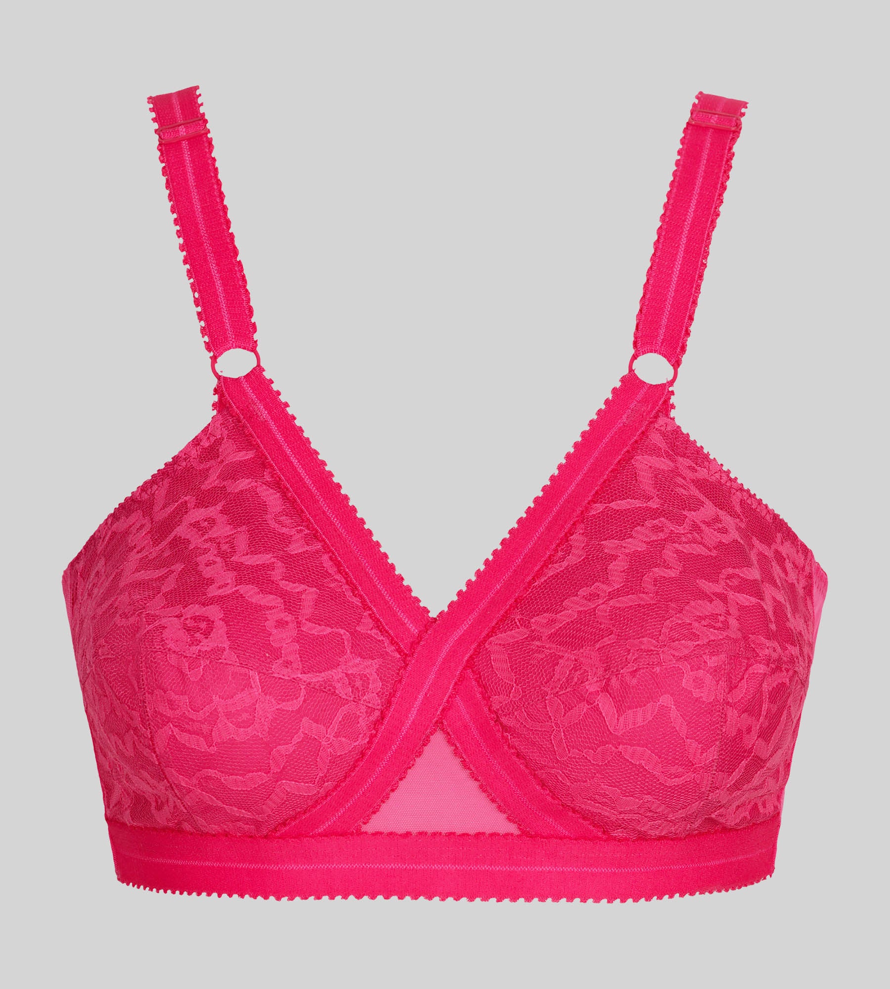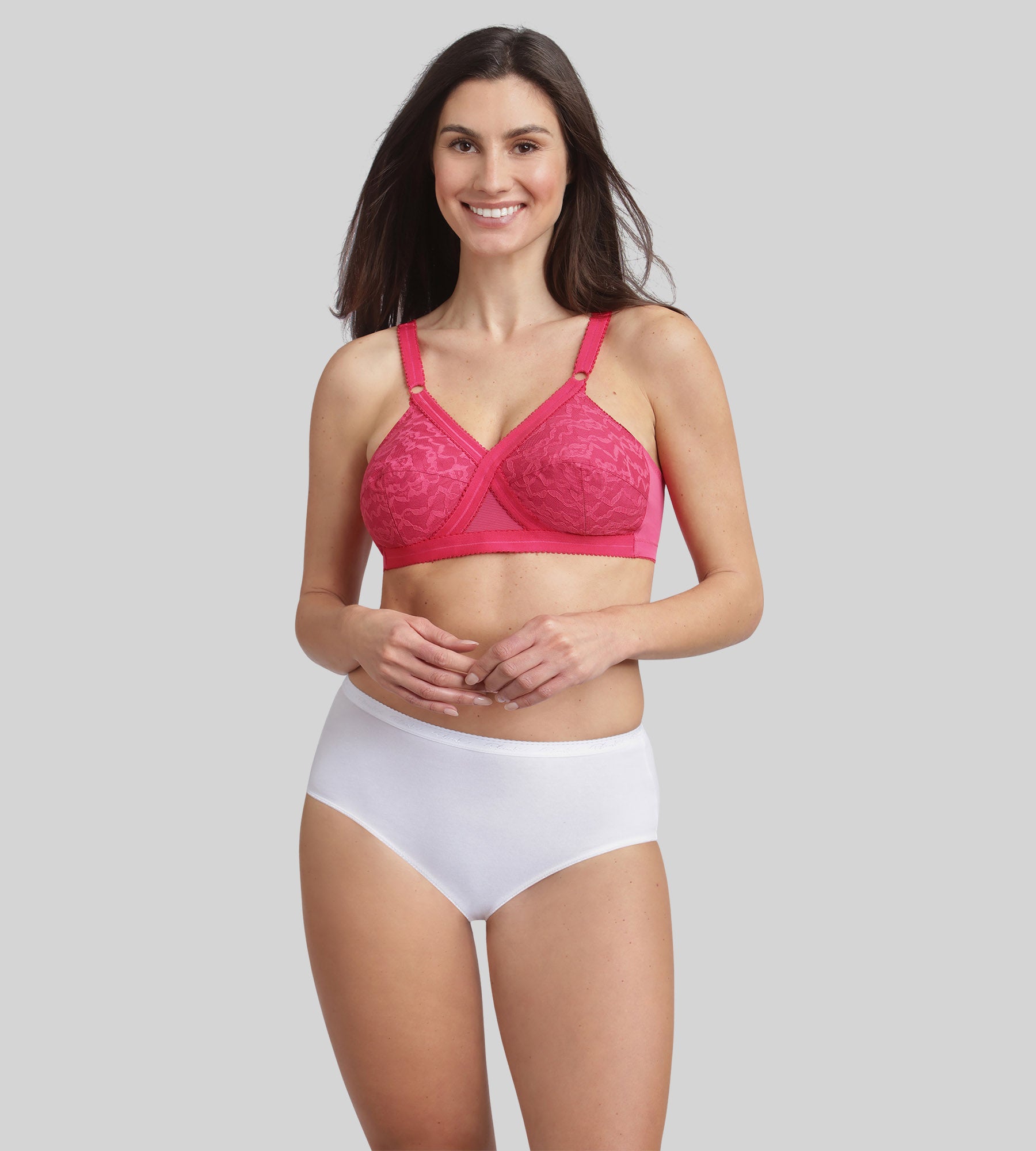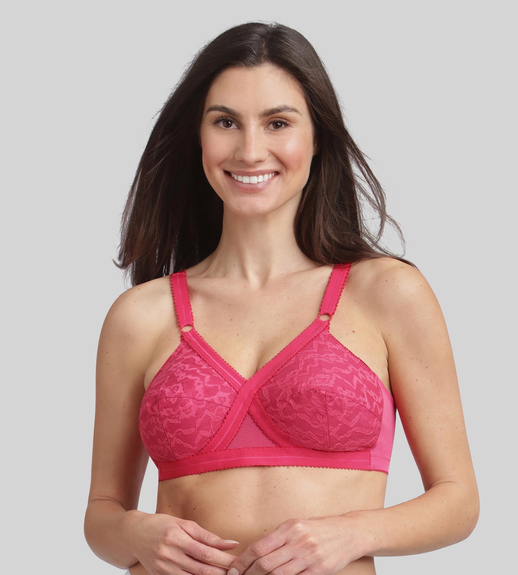 An icon of support and comfort, the Cross Your Heart 556 bra is reinvented in a vibrant and feminine new raspberry colour. This non-wired model combines softness, elegance and support thanks to its iconic cross construction, which naturally separates the bust and ensures perfect support throughout the day. The lace full-cup bras are lined with stiff cotton for a impeccable support. The wide straps, adjustable at the front, and the inner and outer elastic bands have been specially designed to adapt to all body types. This model has been designed to offer a natural shape suitable for all bust sizes, combining the comfort of everyday support with the femininity of elegant lace.