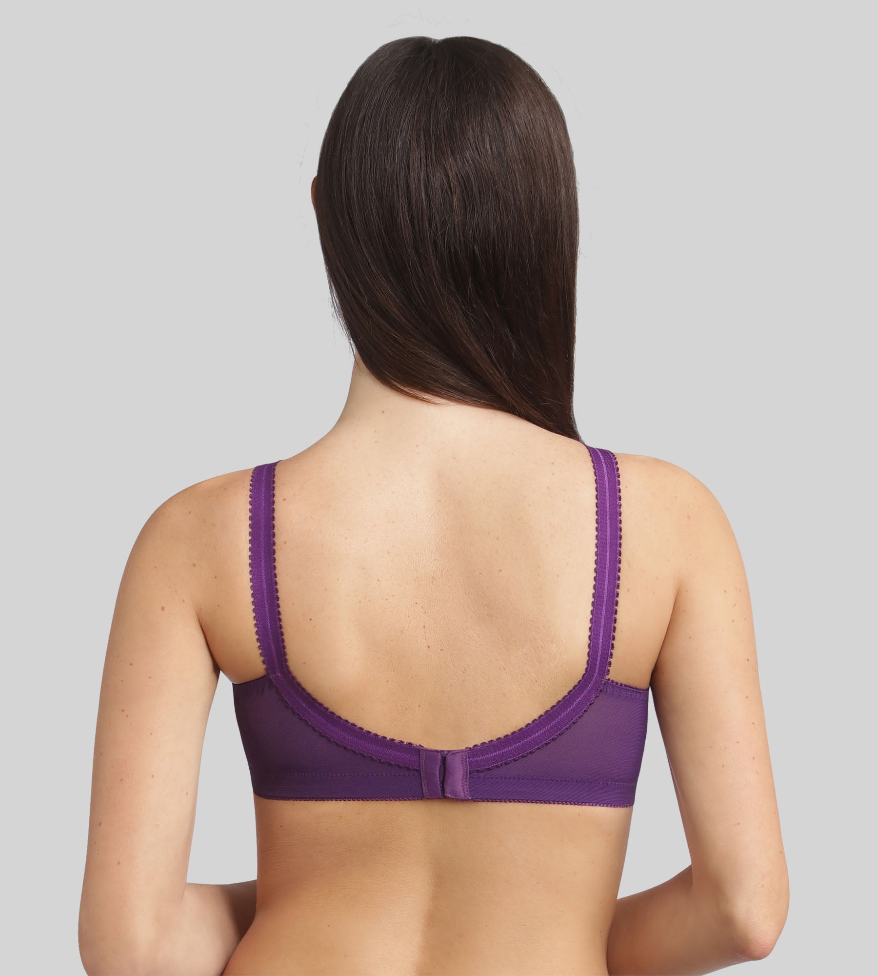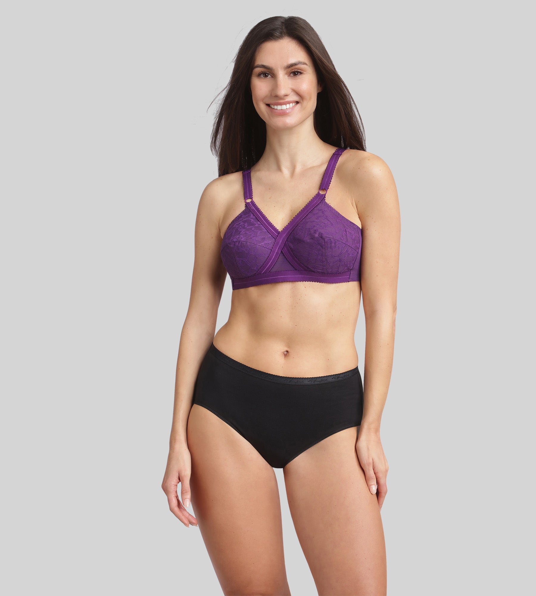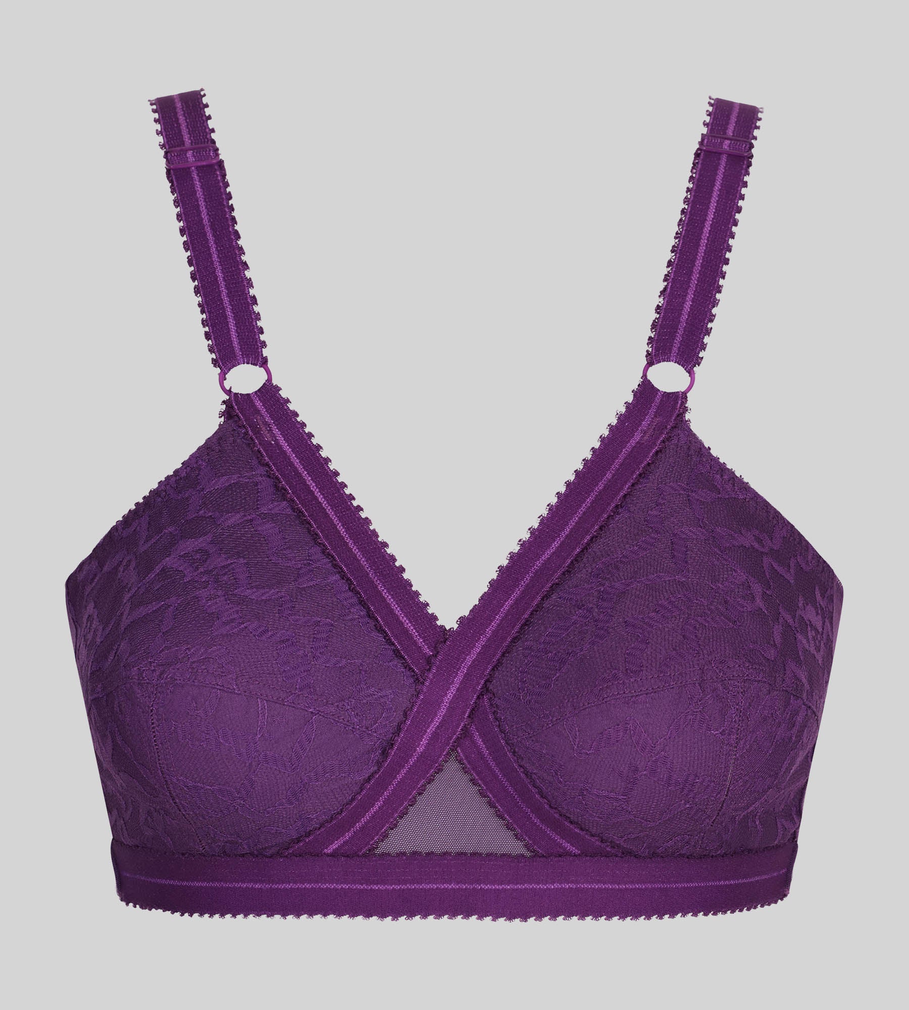 Discover the 556 Cross Your Heart bra in a soft and refined plum colour. A true Playtex® classic, this non-wired model offers unparalleled support thanks to its iconic crossed structure and wide adjustable straps. The full cups, highlighted with tone-on-tone lace, ensure a natural shape and an elegant look. Its dense, stretchy fabric provides ideal comfort, while its U-shaped back cutout guarantees perfect stability throughout the day.