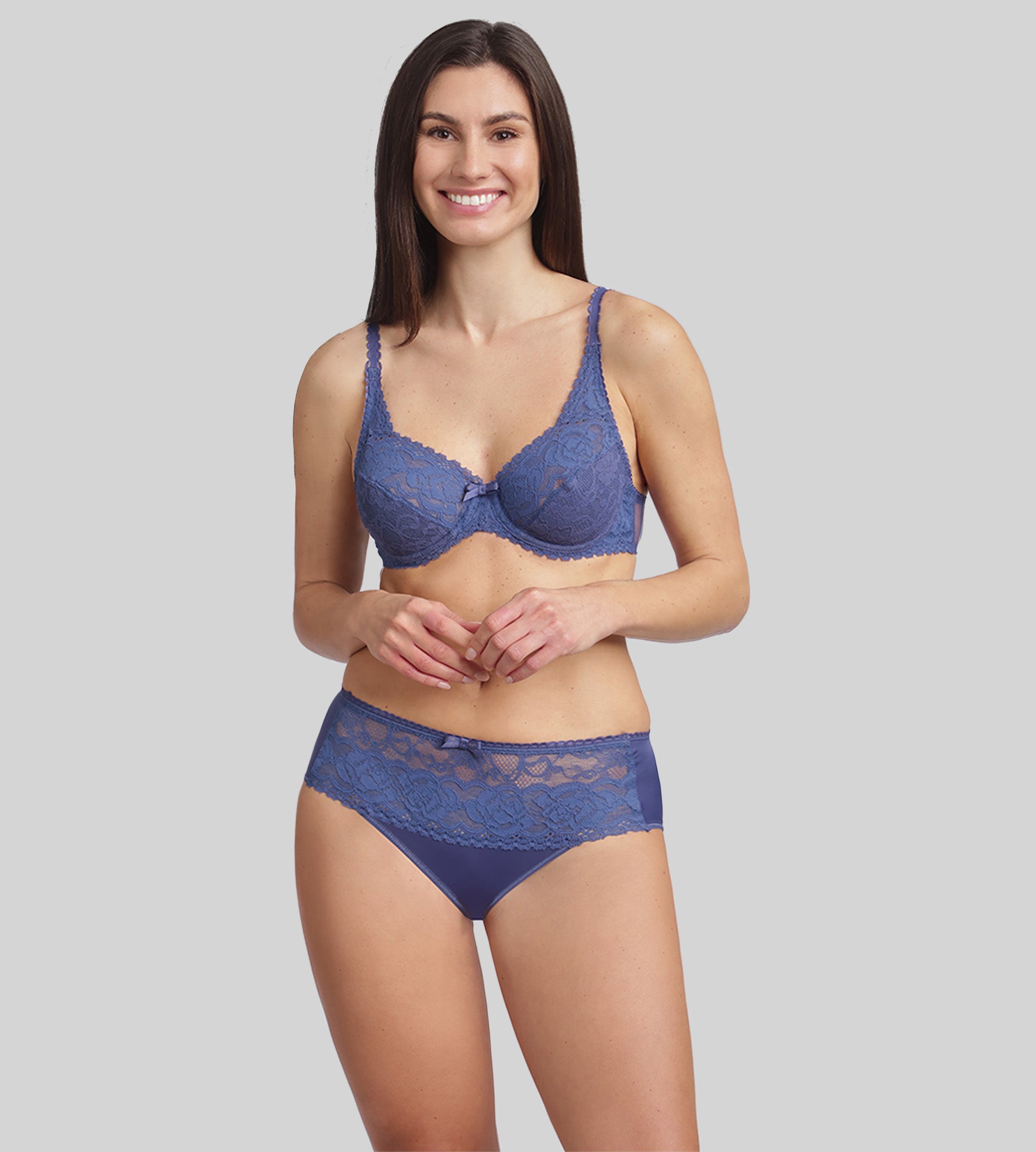 Fall in love with the Flower Elegance Recycled bra in cobalt blue, an intense and luminous shade that brings freshness and modernity to your lingerie collection. This model combines timeless elegance and optimal support, thanks to its full cups and ultra-soft stretch lace that hugs the bust. Its construction ensures excellent shape, amazing lift and a naturally rounded form. Designed for everyday comfort, this bra features discreet underarm pads to prevent pressure from the underwires and offer lasting comfort throughout the day. Its satin details and refined floral lace emphasise a feminine style, perfect for enhancing your curves.