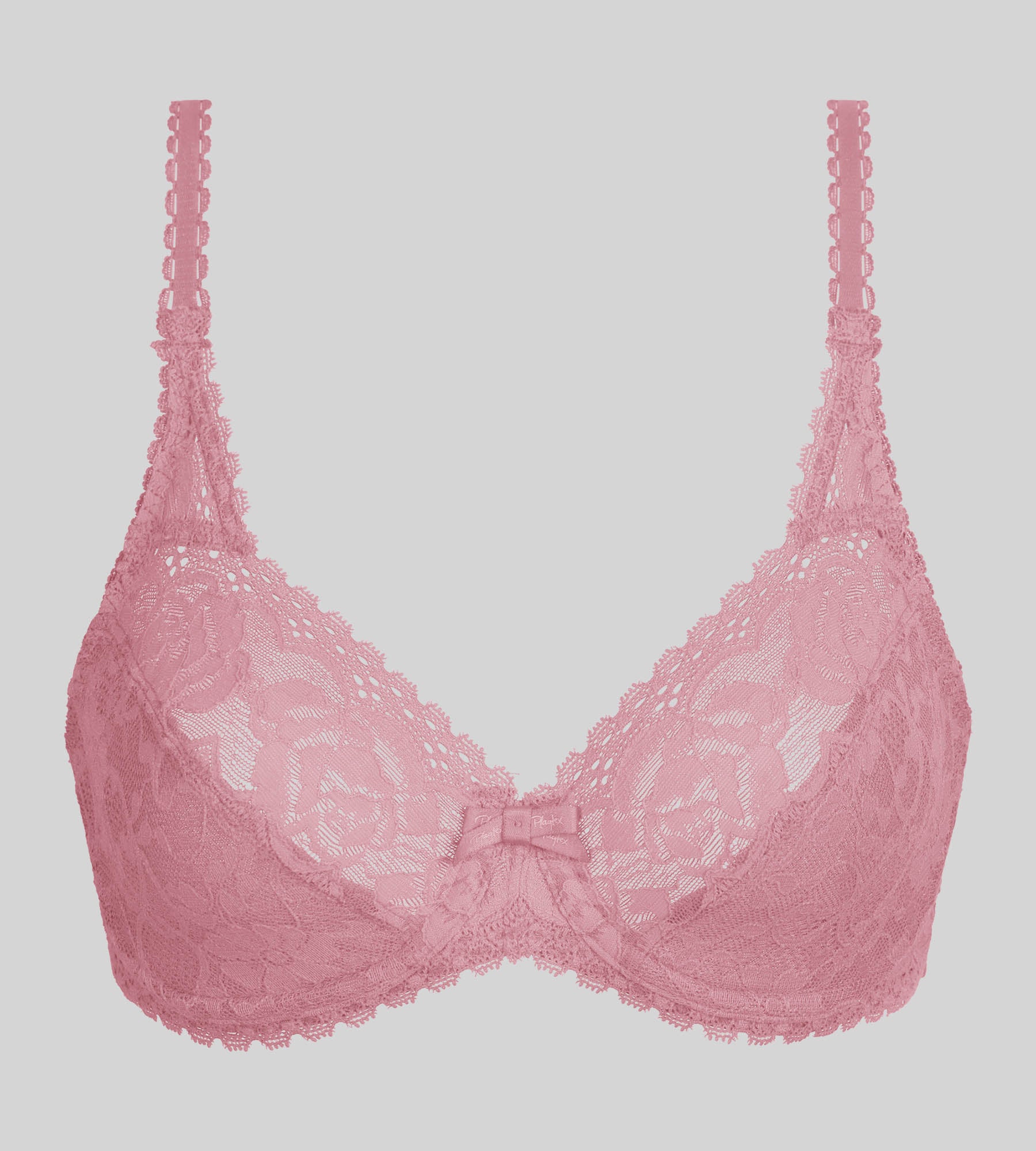 The underwired bra from the Flower Elegance Recycled collection combines elegance, comfort and sustainability. Its full cup shape perfectly envelops the bust for a natural curve. The wide straps, underwire and U-shaped back ensure lasting support and optimal comfort in all circumstances. The pink colour, floral lace and small satin bow between the cups add refinement and femininity. Made from recycled materials, it meets the expectations of environmentally conscious women while guaranteeing an elegant and sophisticated look.