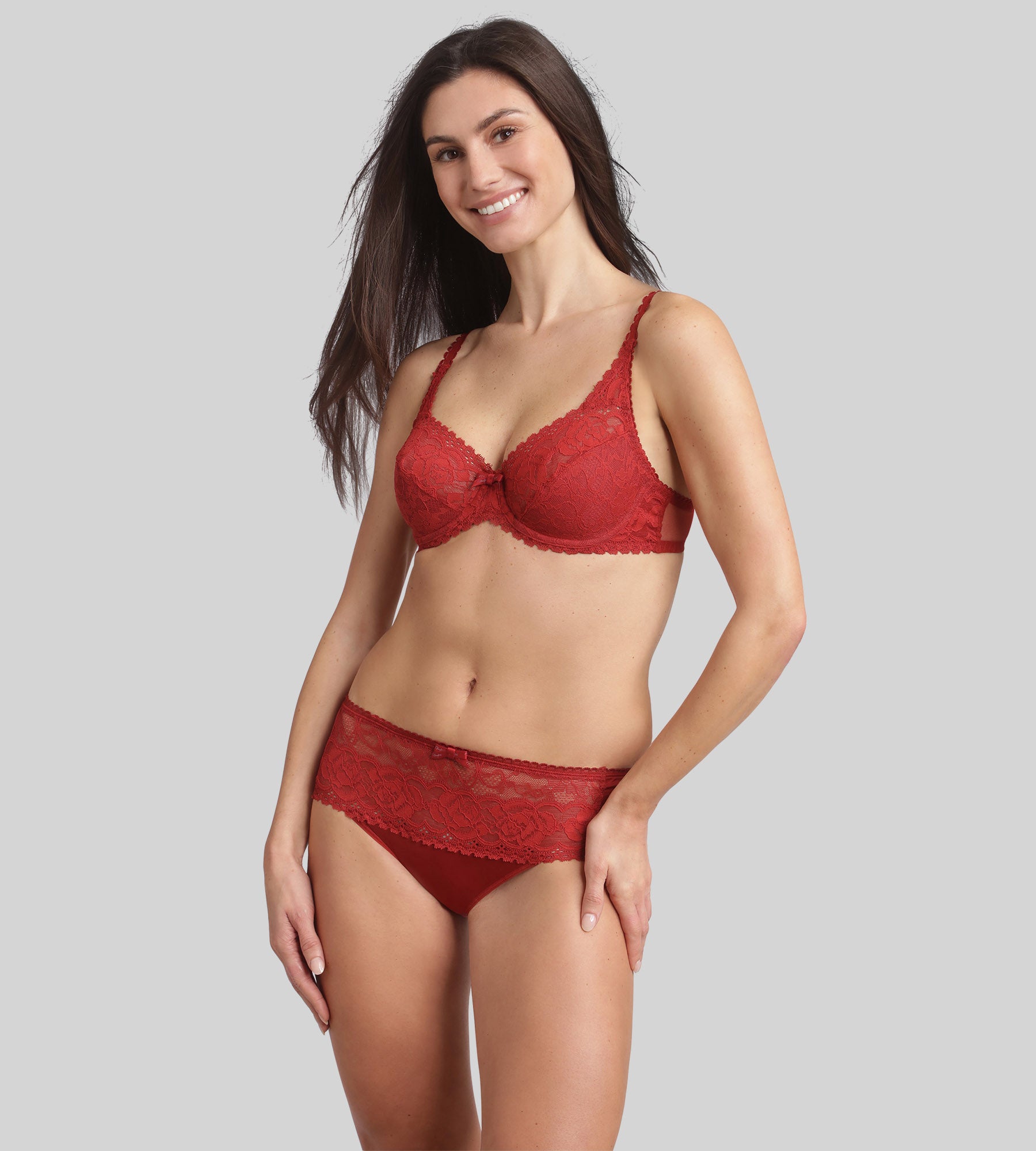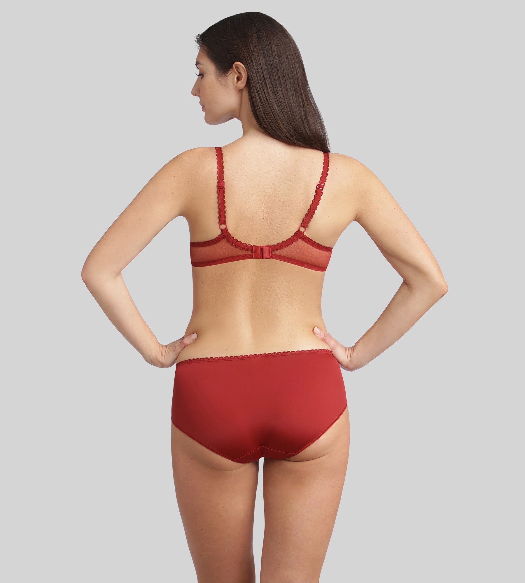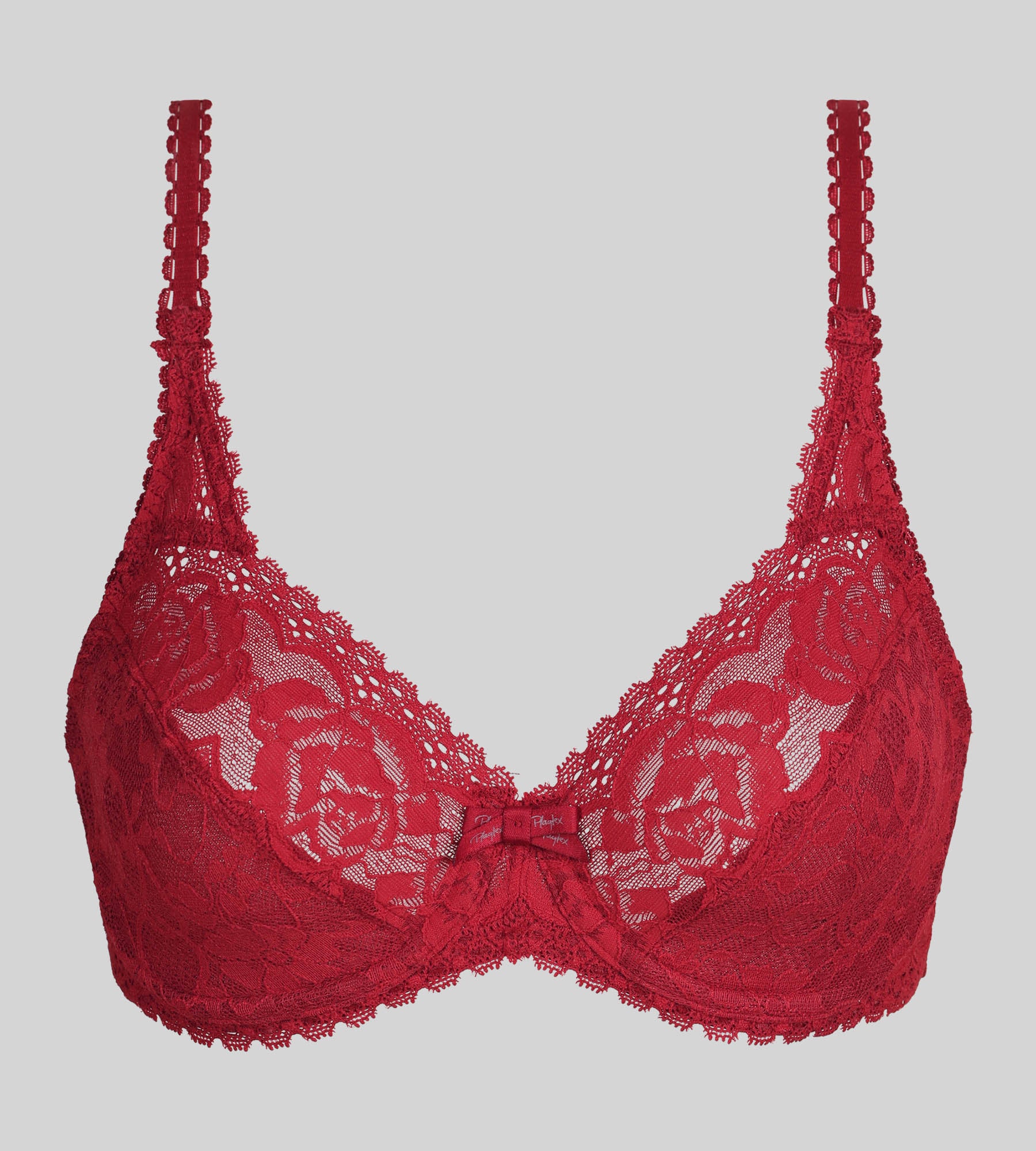 The Flower Elegance Recycled full cup bra in red velvet captivates with its timeless elegance and commitment to sustainability. Its full cup underwired design naturally enhances the bust while offering impeccable support. The delicate floral lace and small satin bow between the cups add a touch of refined femininity, while the wide straps and U-shaped back ensure optimal comfort, even for larger busts. Made from recycled materials, this model combines style, comfort and environmental awareness. And in its velvety red shade, it exudes an air of elegant sensuality, perfect for revisiting the classics with boldness and modernity.