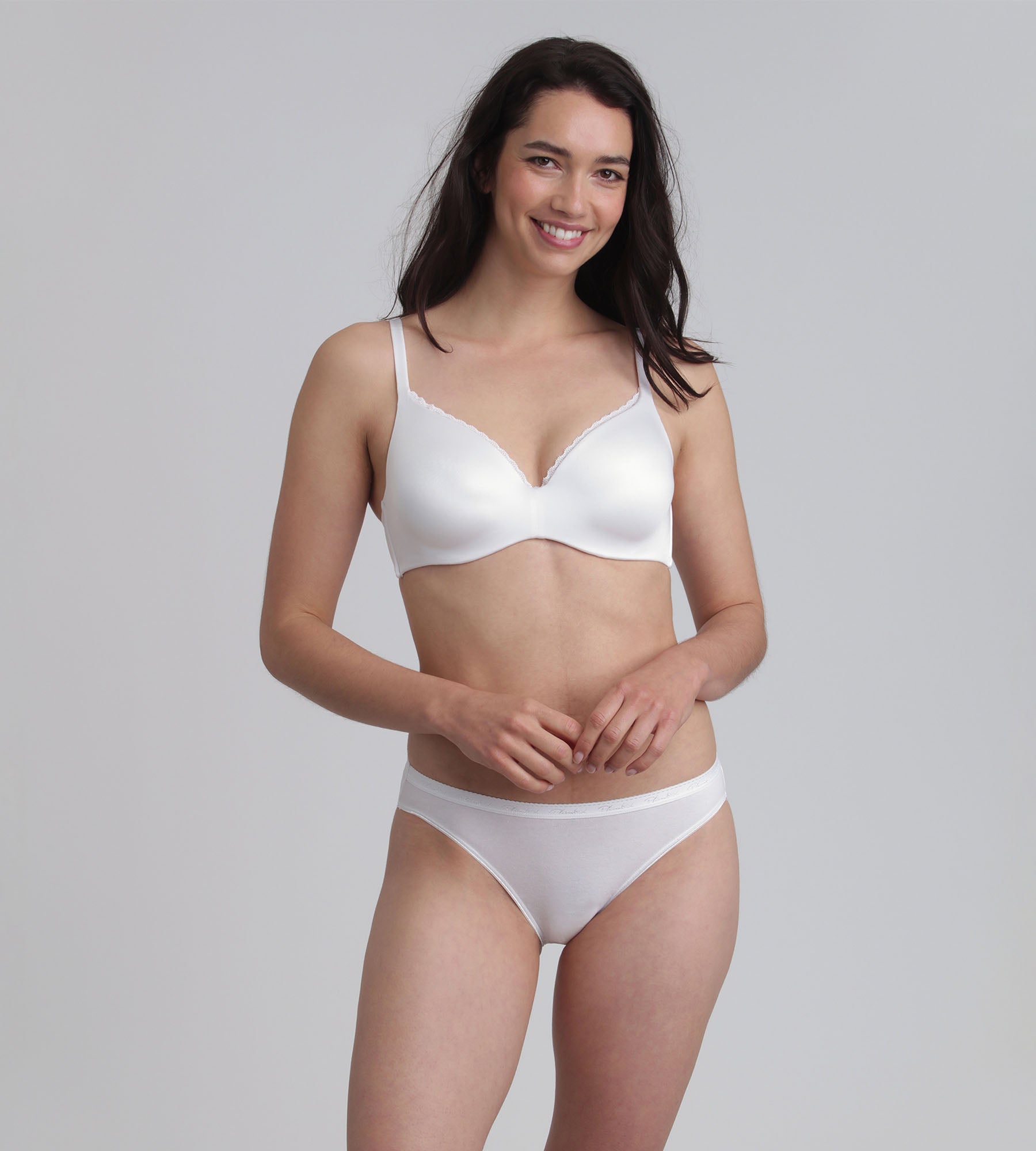 Vous allez adorer ce soutien-gorge coque en microfibre irisée et blanche de la ligne 24h Soft Absolu. Dans un style actuel et élégant, mariez ce dessous féminin avec une culotte coton à la forme midi, haute échancrée ou maxi assortie de la gamme Coton Bio.